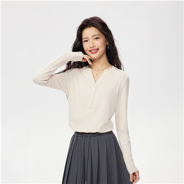【網上獨家】女裝純色V領修腰彈力長袖T恤